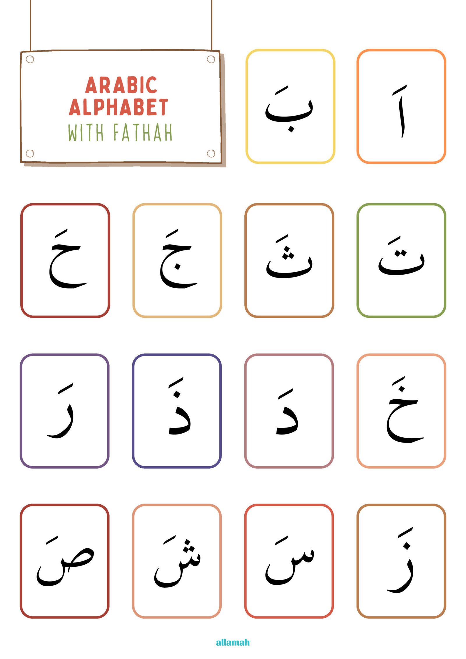 Shows Arabic letters with the short vowel marks fatha, kasra and damma. Each letter is demonstrated with the vowel, helping children learn correct articulation. This is essential for reading the Qur’an accurately as vowels change meaning and pronunciation.